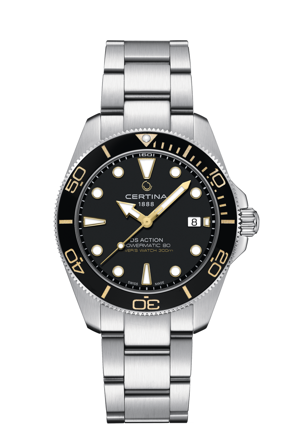 300 metrin vesitiiviydellään ja ISO 6425:2018 -sertifioinnillaan tämä malli täyttää ammattimaisten sukelluskellojen korkeimmat standardit. DS Action Diver 40.5 mm on myös virstanpylväs, sillä se on ensimmäinen Certinan kello, jossa on DS-järjestelmän seuraava kehitysaskel: ”New DS Concept Extreme Shock Resistance”.